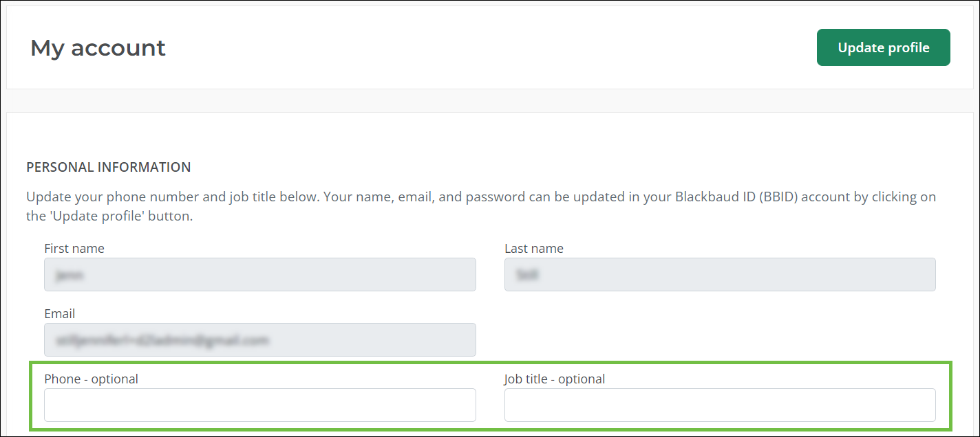 Note: For more information about updating your account information associated with Blackbaud ID, see Update Your Name, Email Address, and Password in Blackbaud ID.