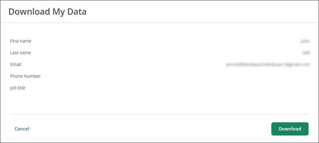 In the Download My Data screen, you can view your personal information, including Name, Email, Phone Number, and Job Title.