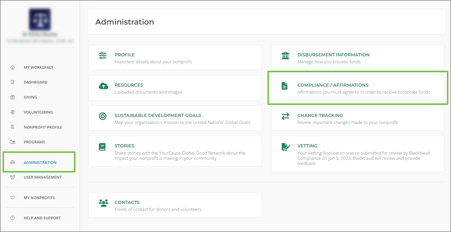 Note: Active Nonprofit Administrators will be notified via email if you have outstanding compliance agreements to complete. A notification will also appear on the My Workspace page in Blackbaud Verified Network.
