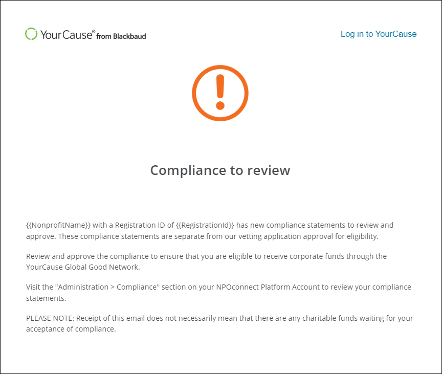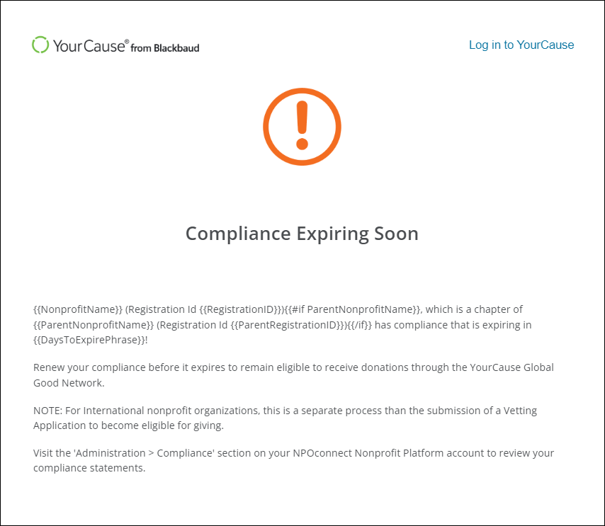 Yes. If you have compliance agreements that are about to expire, an email titled Don't miss out on any potential donations - Compliance expiring soon
