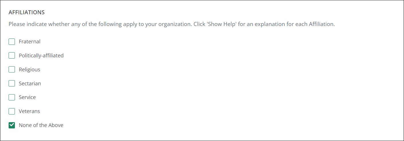 In the Affiliations section, enable the checkbox next to all that apply to your organization or any of your ongoing programs.