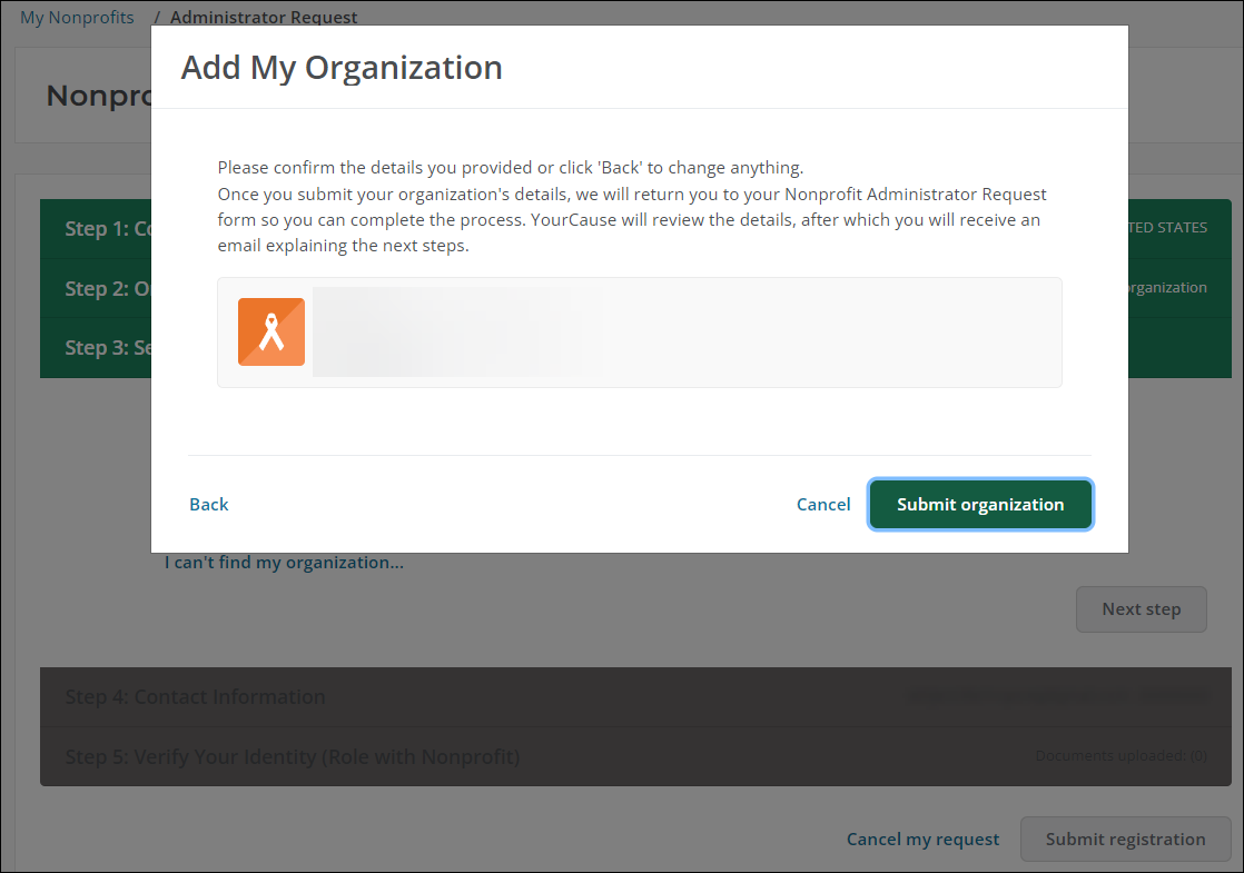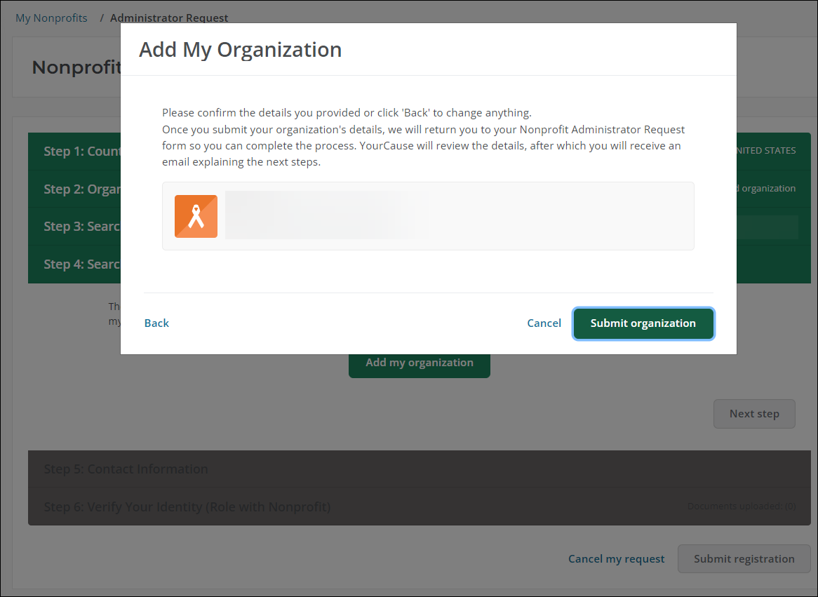Review the details you've provided. If changes need to be made, select Back to return to the previous screen. If not, select Submit organization to submit your organization's details for review.