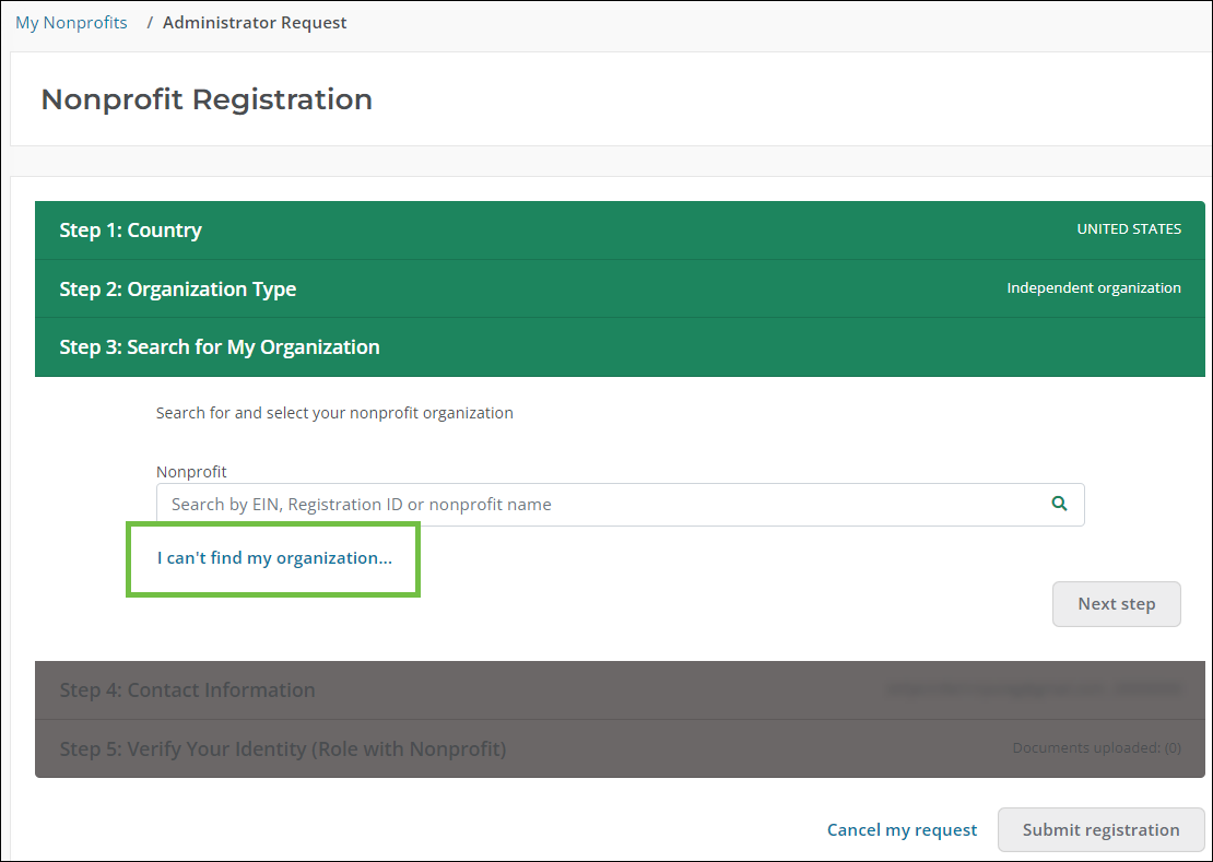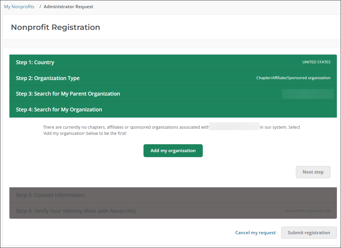 Note: This is only available for stand-alone nonprofits and chapters in the United States. If you represent a parent organization or organization outside of the United States, see What should I do if I can't find my organization?.