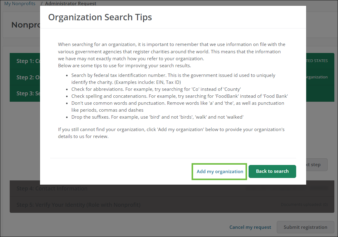 Tip: Organization details in Blackbaud Verified Network match those on file with the government agency that registered the charity, such as the IRS. Because of this, information in our system may not exactly match how you refer to your organization. Prior to adding a new organization, we encourage you to first review the tips in How do I improve my search results?.