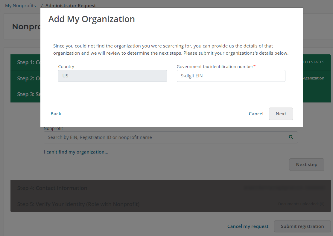 In Add My Organization, enter the 9-digit Employer Identification Number (EIN) for your organization in the Government tax identification number field.