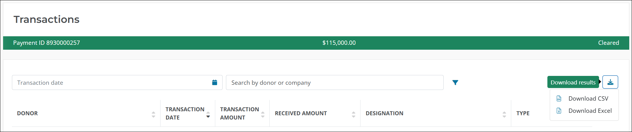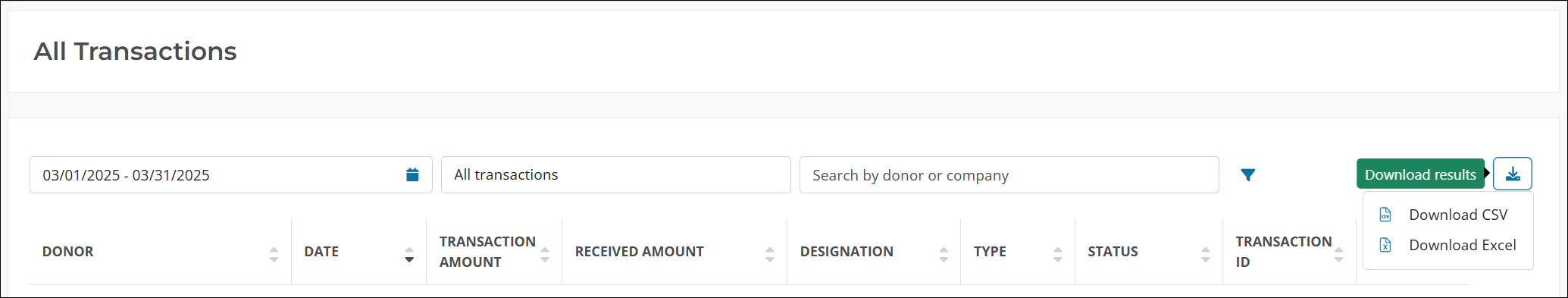You can download a copy of your donation payments and transactions from the Giving > All Transactions area. Details are saved as an Excel file to further analyze or store in your own records.