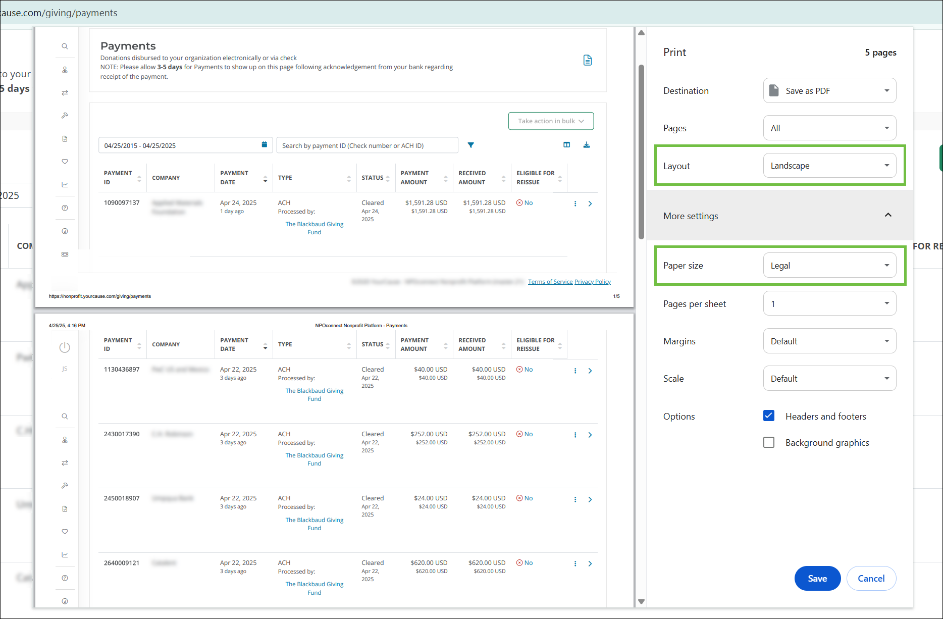You can use the Print tool in your web browser to save your donations to a PDF file or print a paper copy. These steps are for printing from your laptop or desktop computer.