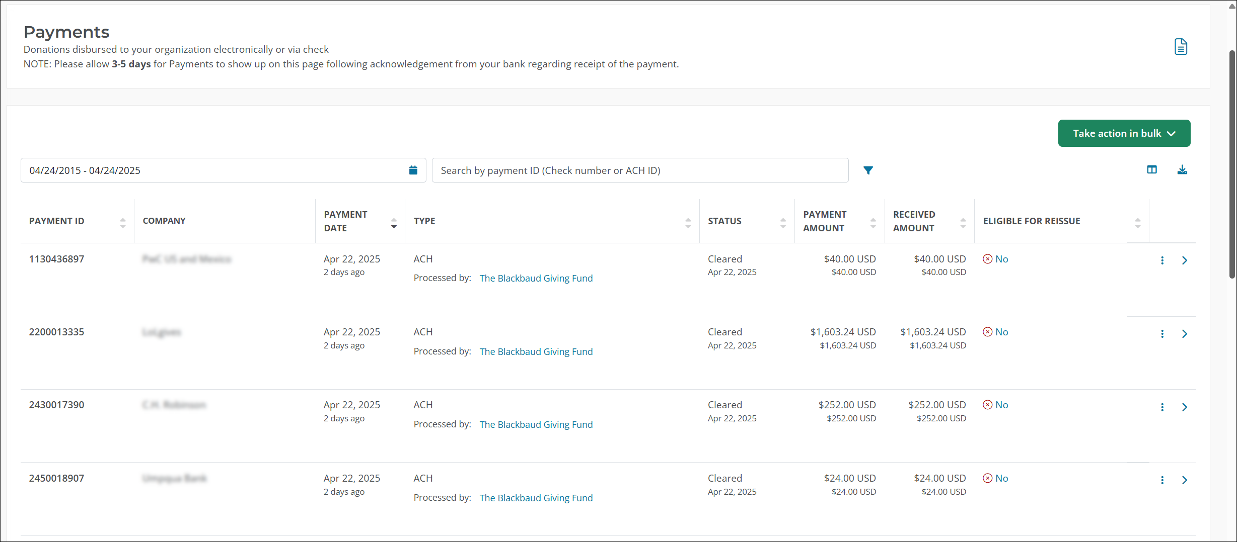 Tip: Don't see a payment? It may take three to five days for payments to appear in Blackbaud Verified Network following acknowledgment from your bank regarding receipt of payment.