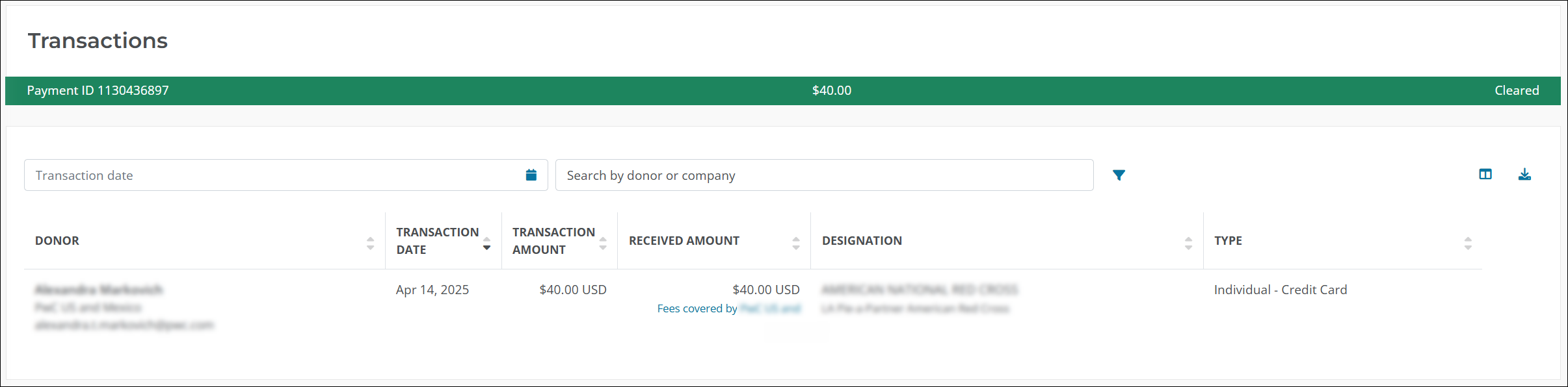 On the Transactions page, you'll see all donations included in this payment. Donations are grouped based on the donor's company and date.