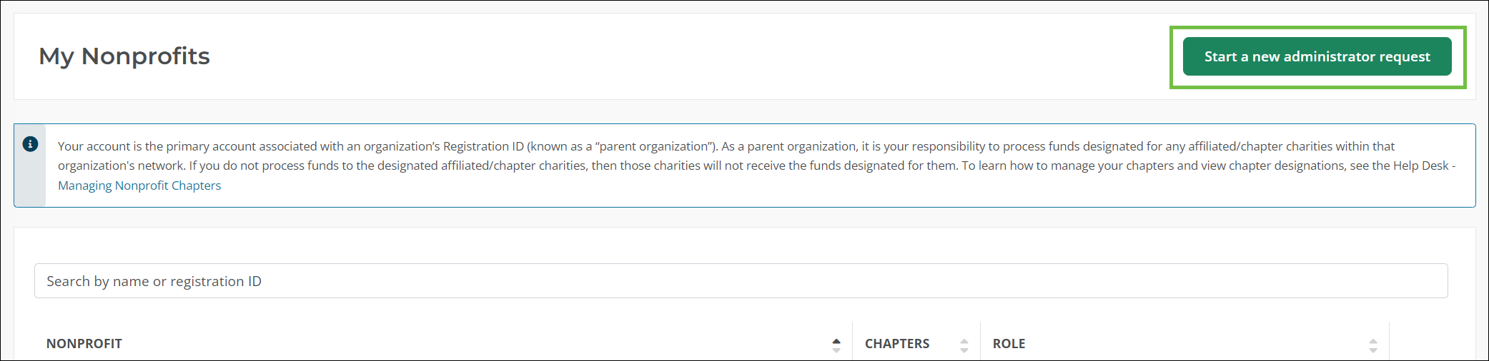 In My Nonprofits, select Start a new administrator request.