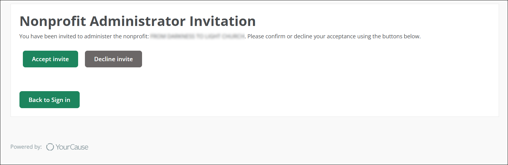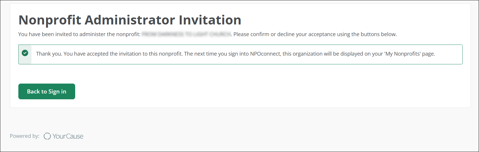 Once complete, you'll receive confirmation that the invitation was successfully accepted or declined. If you accepted the invitation, this organization will appear in My Nonprofits the next time you log in to your account.