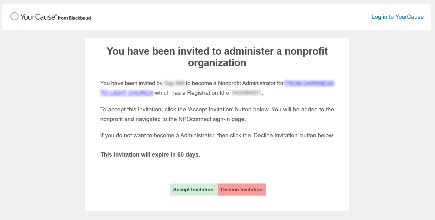 In your email inbox, find and open the email titled You have been invited to administer a nonprofit organization. Select either Accept invitation or Decline invitation to proceed.