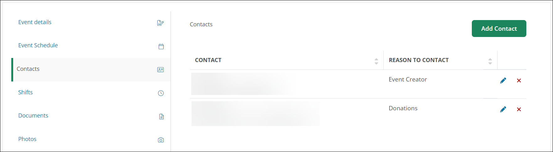 Note: The event creator is automatically added as a contact. Contact information (e.g., name, email) for all contacts will be visible to volunteers.