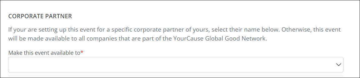 In the Corporate Partner section, click on the dropdown and select a partner or community in the YourCause Global Good Network that your event will be available to.