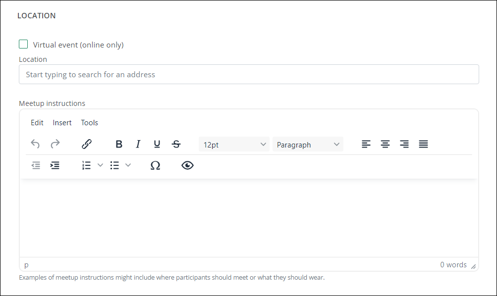 Is the event virtual or doesn't have a specific location? Enable the Virtual event (Online only) checkbox.