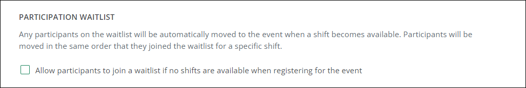 To allow participants to join a waitlist if no shifts are available at registration, enable the Allow participants to... checkbox in the Participation Waitlist section.