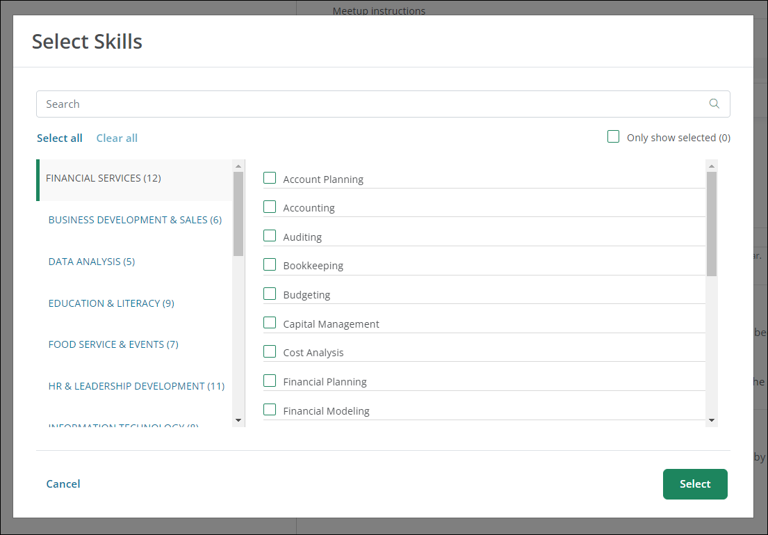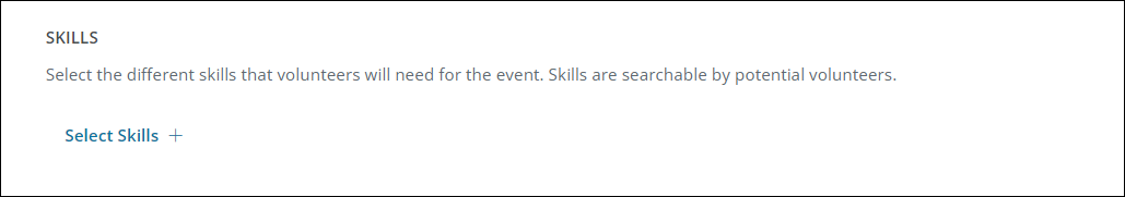 In the Skills section, click on Select skills to choose the different skills that volunteers will need for the event or can be used as keywords for volunteers searching for events.