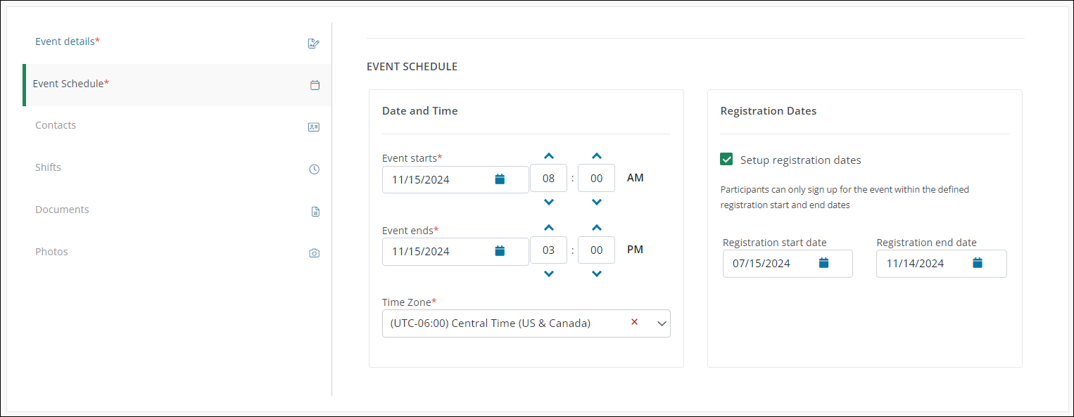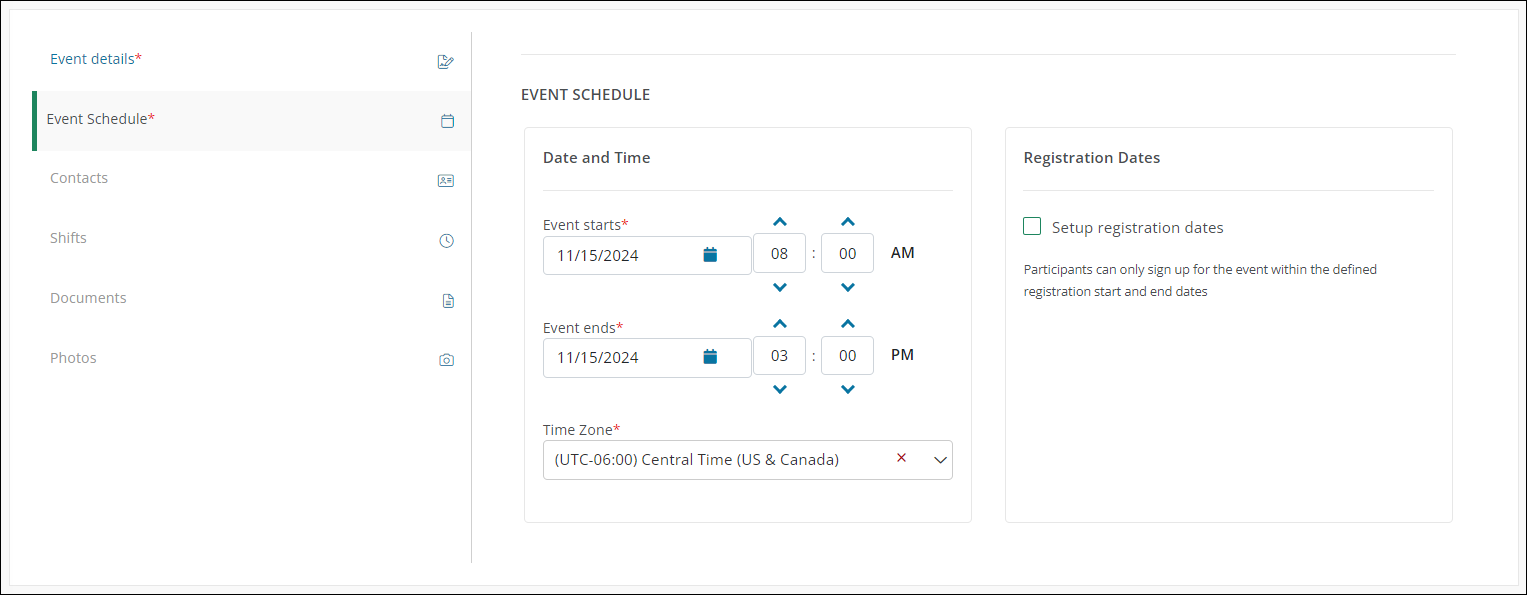 Optional - In the Registration Dates section, enable the Setup registration dates checkbox if there is a specific date range when volunteers can sign up.