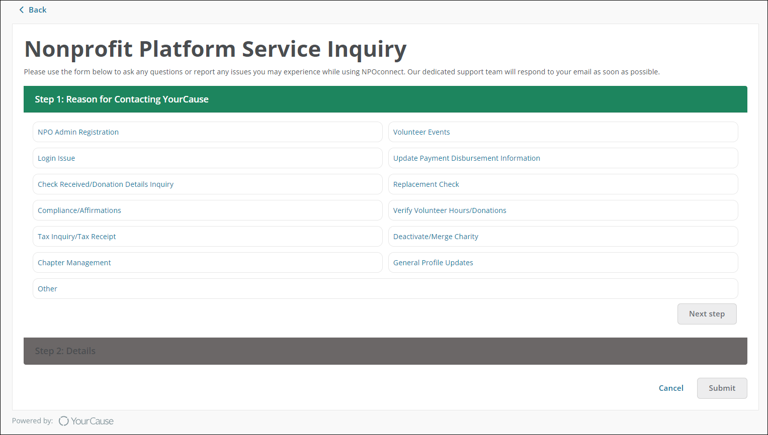 The Nonprofit Platform Service Inquiry form now automatically selects a support reason based on where in NPOconnect you access the form. If you need to choose a different reason, click on the Back link below the suggested help articles to return to the full list of support topics.