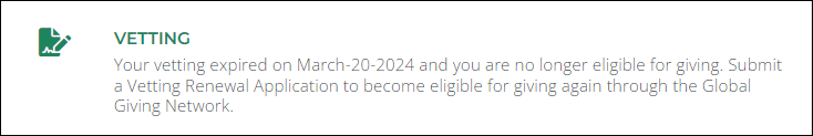 Emails titled Your Nonprofit Organization's Vetting is Expiring Soon now include the vetting expiration date in Day-Month-Year (e.g., 3-May-2024).