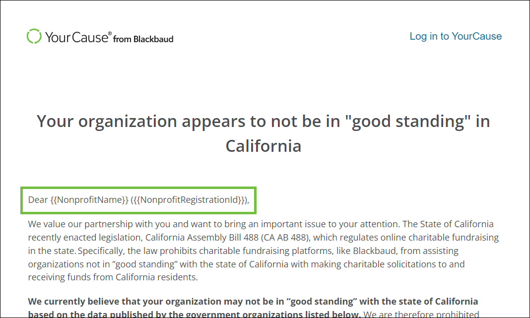 Note: As a reminder, this email is sent to nonprofit organizations found on one or more of California’s revocation lists. Per California Assembly Bill 488 (CA 488), your nonprofit cannot make charitable donations to or receive funds from California residents until resolved. For more information, see California Assembly Bill 488: Impact to Charitable Organizations or California Assembly Bill 488: FAQs for Nonprofit Admins.