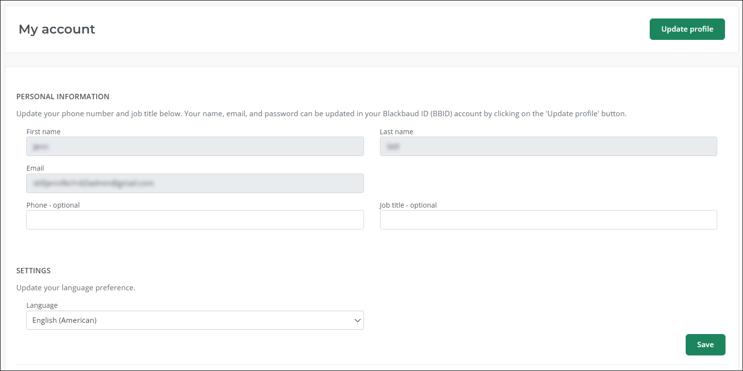 You can still update your phone and job title on the My Account page in NPOconnect. To change your other details, you must navigate to your Blackbaud ID account. Click on the Update profile button at the top of the My Account page to open it in a new tab. Any changes made to your Blackbaud ID account will be reflected the next time you log in to NPOconnect.