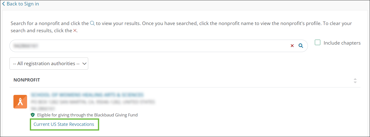 You can now easily view an organization’s revocation status by clicking on the Current US State Revocations link in the public nonprofit search. This link will only appear if there are current, active revocations for this organization. The Revocation List window that appears shows the state revocation lists the organization has been found on, their status, the date this information was last updated, and other details.