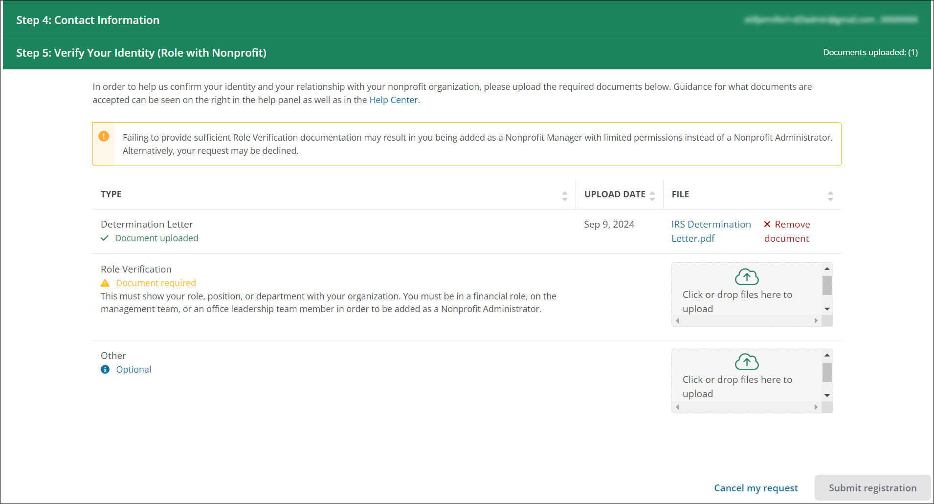When registering as a Nonprofit Administrator, you’ll now see additional guidance in Step 5: Verify Your Identity that explains what documentation is required to be approved as an Administrator. This includes examples of Role Verification documentation, such as documents that show your role, position, or department with your organization as well as the requirement that you must be in a financial role, on the management team, or an office leadership team member to be an Administrator.