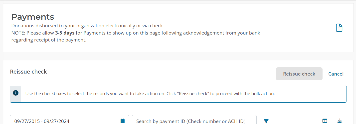 To request a check reissue, you can now find the Reissue check tool in the new Take action in bulk menu in the Giving > Payments and Transactions area. This tool can be used to request one or more checks be reissued.