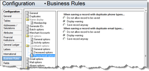 To prevent duplicate contact information on constituent records in The Raiser’s Edge 7.95, you can set a business rule to disallow multiple phone numbers and email addresses of the same type to be saved. The phone and email options business rule is flexible so that you can set different rules for phone numbers and email addresses. You can also set the rule to allow duplicate types if you prefer, or display a warning each time a duplicate type is about to be saved.