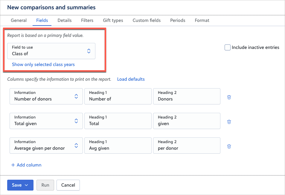 In response to your feedback, Comparison and Summaries reports in Standard reports now support the Class of field, allowing you to run reports broken down by class years. You can apply this field from the Fields tab when building or editing a report. Previously, class year data was only available in database view.