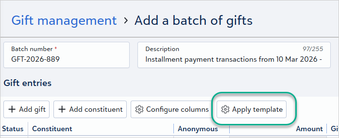 From the grid view, select Apply template to apply an existing batch template to quickly set up your batch, maintain consistency, and reduce data entry errors. Batch templates define which fields appear in the grid and can include default values for those fields. When you apply a template to a new or existing batch, the selected fields and default values are added automatically.