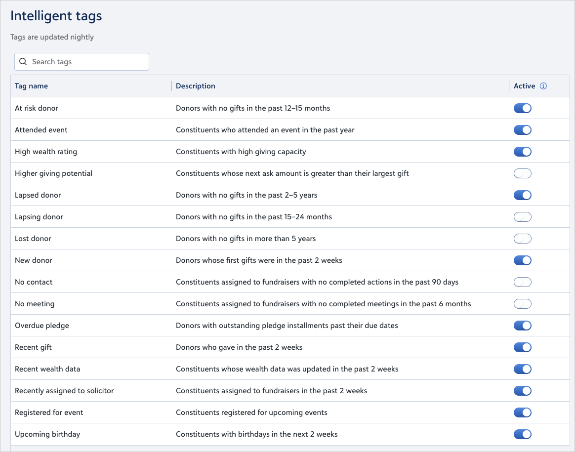 Intelligent tags — previously known as Tags in Raiser’s Edge NXT — are now managed directly in Settings, giving organizations more control over which donor insights appear throughout their fundraising workflows. These insights highlight key donor behaviors such as recent giving, lapsing activity, event participation, wealth changes, and personal milestones. They appear across the product, including constituent records, lists, Work Center, and prospect outreach recommendations in Chat for Blackbaud AI.