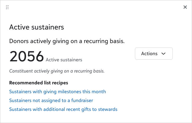 Active sustainers: Select this segment to open a modal that displays donors who currently give recurring gift cash payments. Lists are provided to help you continue cultivating these key relationships, reinforcing loyalty and strengthening long-term engagement.
