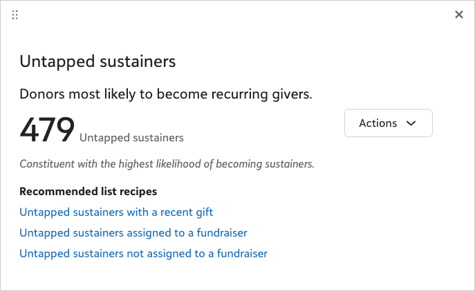 Untapped sustainers: Select this segment to open a modal that shows how many current donors in your database have the highest likelihood of becoming sustainers. You’ll also see recommended lists to help you identify and cultivate these donors into active sustainers. This feature empowers you to focus on high-potential relationships and grow your program strategically.