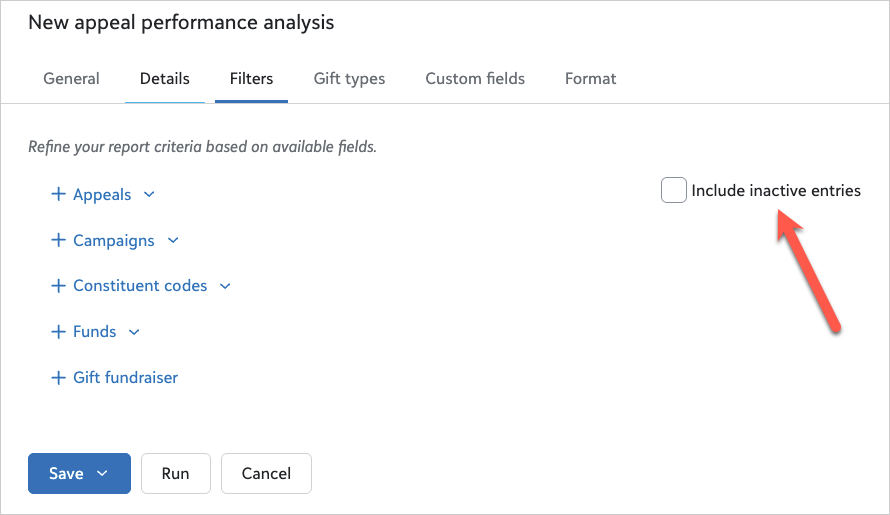 From the query editor, on the Criteria tab, select available campaign, funds, or appeals criteria fields. Under the search field, select Include inactive.