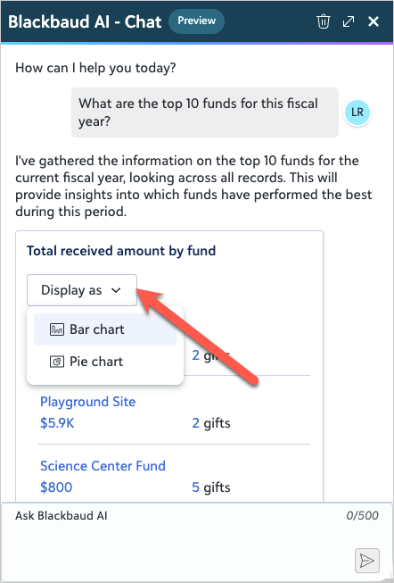You can now turn common giving analysis questions into clear visuals — right in Chat for Blackbaud AI. Switch between Bar chart, Pie chart, or List view using the new Display as field, then print or download the chart image from the menu to share or save.