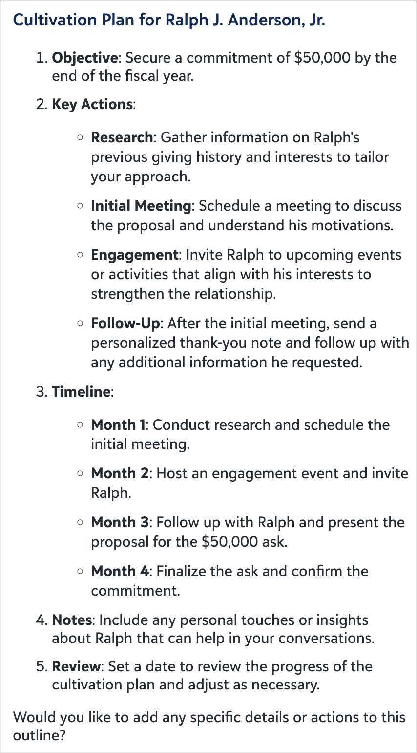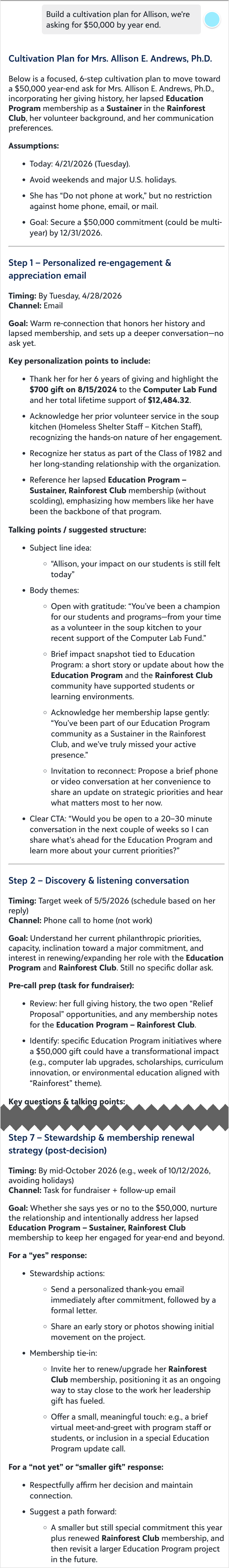 Tip: If the constituent has an open opportunity, run this prompt while viewing that opportunity record. Blackbaud AI will tailor the cultivation steps to advance that specific proposal toward your ask amount.