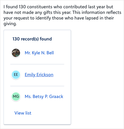 Focus on high-value lapsed donors: "Show me constituents who gave last year but not this year with lifetime giving over $10,000"