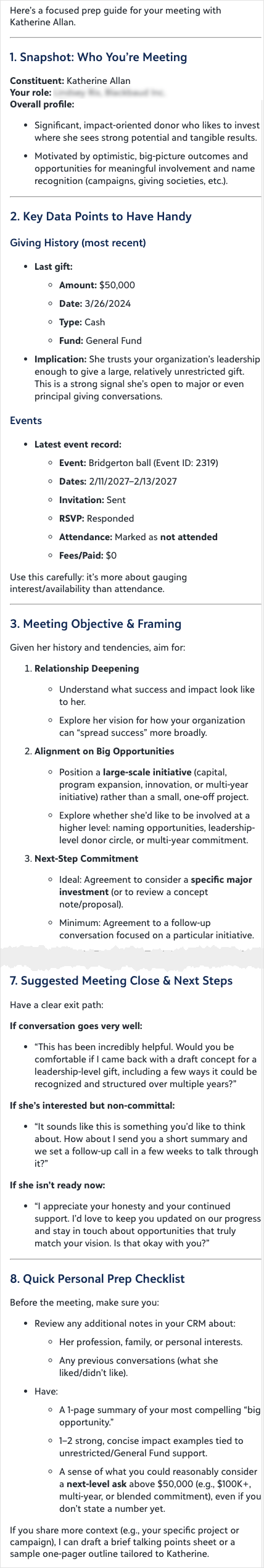 NewGet ready for a donor meeting with personalized conversation topics and background tailored to the specific constituent you're meeting with. Chat for Blackbaud AI draws on giving history, recent activity, and relationship data to help you walk in prepared. The best results come when you open the constituent record before using this prompt. With record context loaded, the response incorporates the donor's giving history, event attendance, any open opportunities, and recent actions to give you specific points to reference. Without record context, the response provides general best-practice framing for donor meetings.