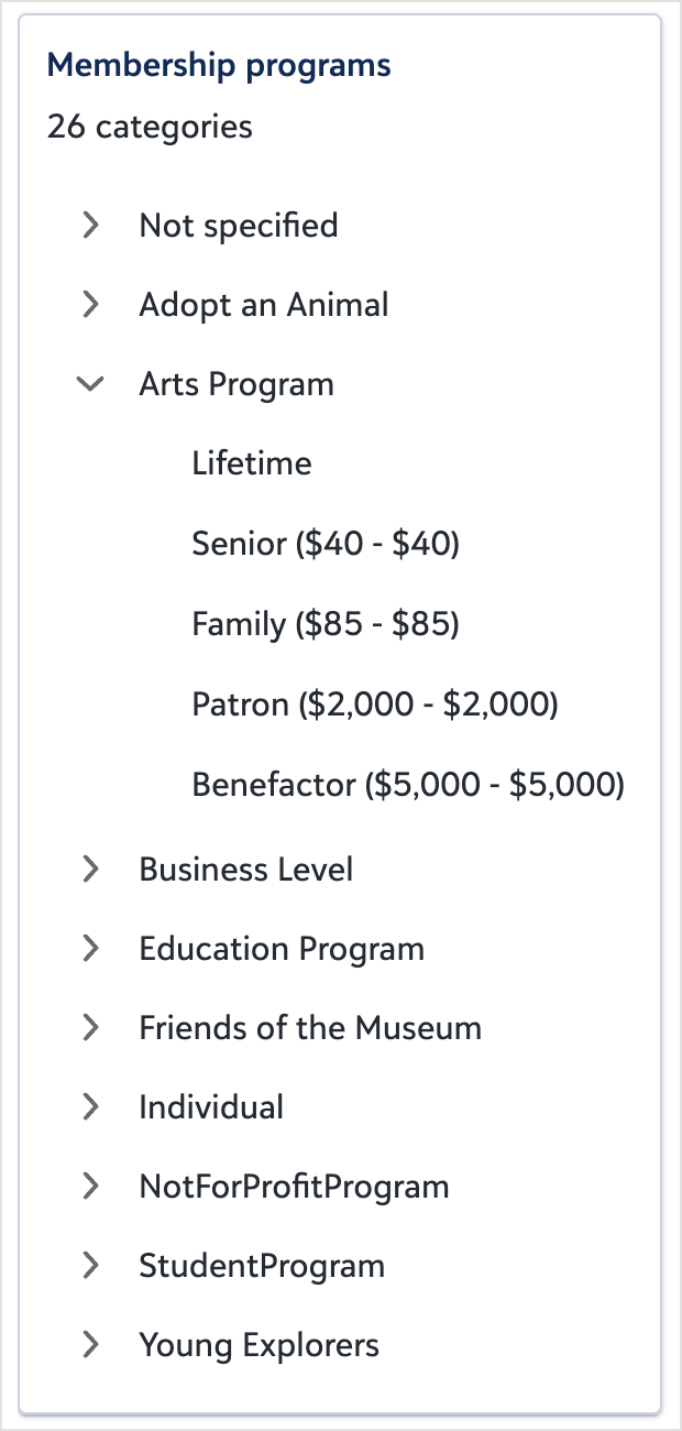 NewQuickly see all configured membership programs, with their categories, subcategories, and dues ranges, so you understand your full membership structure at a glance.
