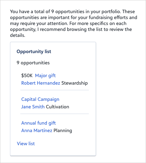Filter by amount to zero in on opportunities at the right giving level. Examples: "with an ask over $50,000", "with expected amount under $10,000", "funded for more than $25,000".