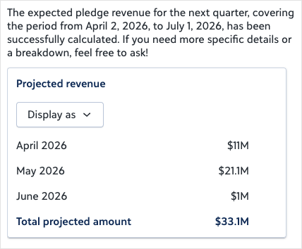 Tip: If your fiscal quarter doesn't align with calendar quarters, specify the exact date range in your prompt. For example: "How much pledge revenue is expected between July 1 and September 30?"