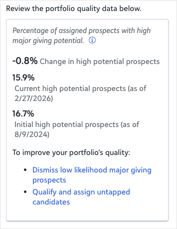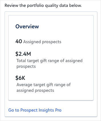 PremiumSee how your major giving portfolio is performing so you can identify which prospects to prioritize, who is ready to qualify, and where your pipeline needs attention. This prompt opens your Prospect Insights portfolio quality view, which shows the breakdown of your assigned prospects and their target gift ranges, and surfaces recommendations to help you take action on the right people at the right time.