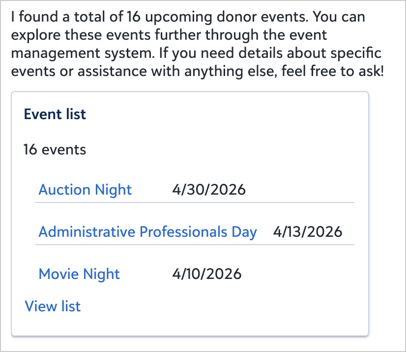 This prompt returns organizational events only. It doesn't support filtering by attendee or donor. To see events a specific constituent has attended, open their record and ask about their event participation.