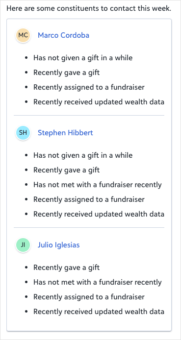This prompt works best as an open-ended starting point. If you already know you want to focus on a specific segment, such as lapsed donors, constituents in a particular location, or people who gave to a specific fund, a more targeted prompt like "Show me lapsed donors in my portfolio" will get you there more precisely. But when you want to surface who genuinely needs attention right now, this prompt delivers that without requiring you to know exactly what to look for.