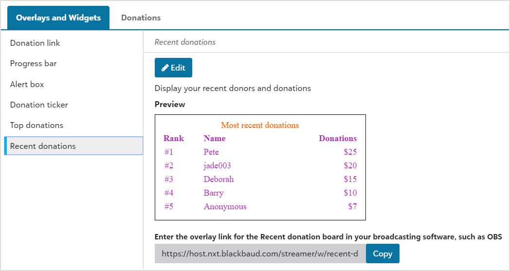 Copy the link, and enter it in your broadcasting software to create and position the overlay.