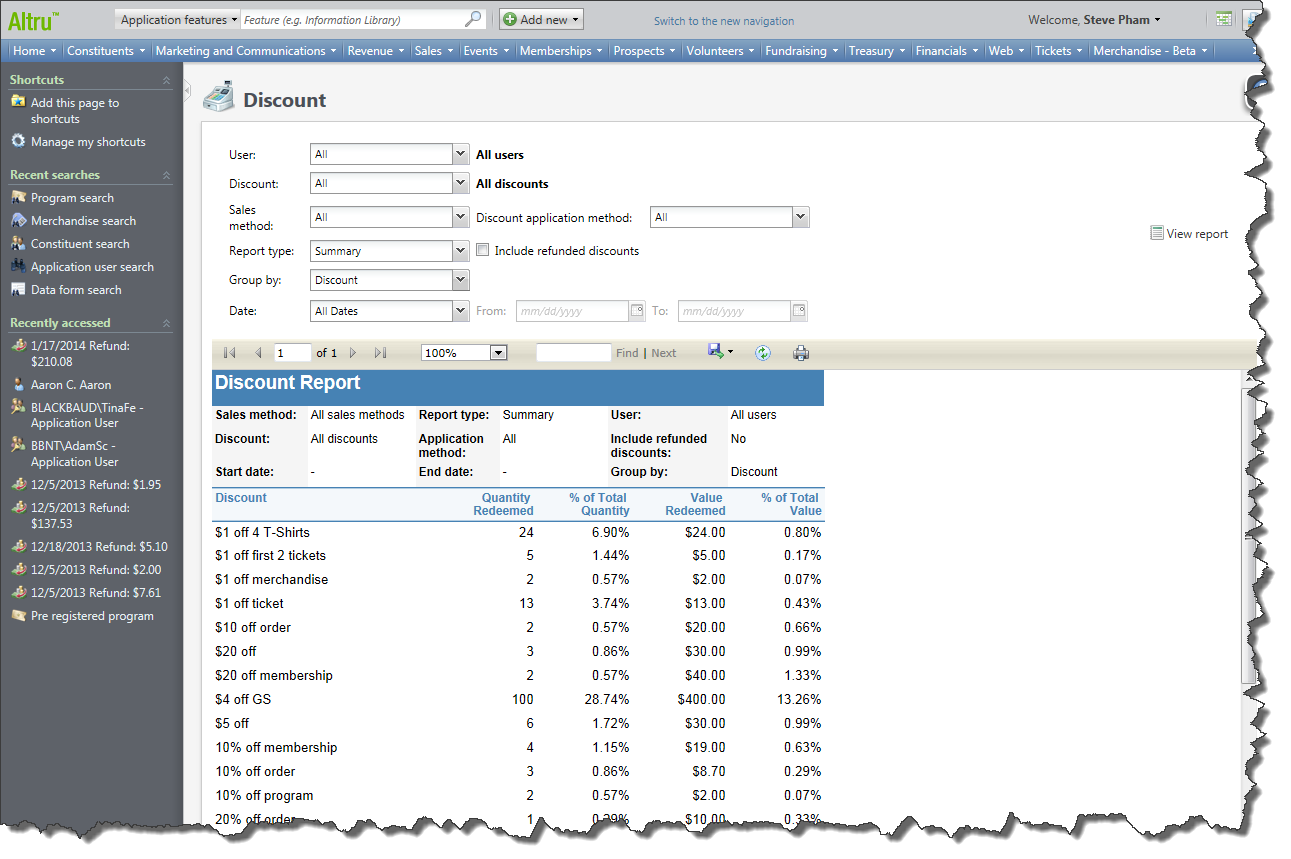 Previously, on this report, you could not have the report type set to summary and group by discount. In this release, you can now view a summary of the discounts used.