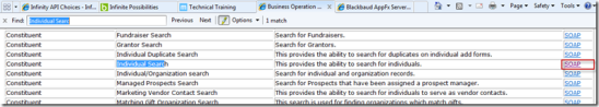 Within my browser, I press CTRL+F to begin my search. I search for "Individual Search" and click the SOAP link to obtain the URL to the web service endpoint.